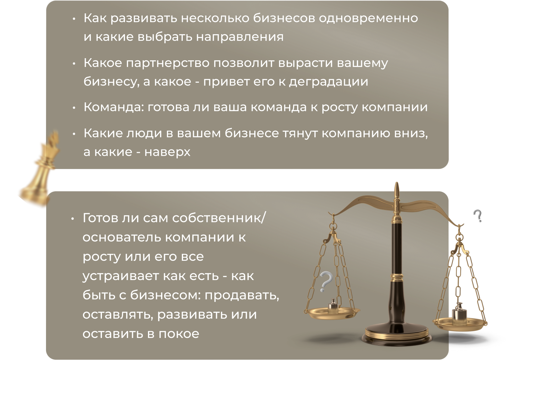 ● реорганизация и структурные изменения в компании; ● открытие новых направлений деятельности компании; ● закрытие какого-то участка; ● партнерство: как выбрать партнера или как выйти из партнерства; ● слияния и поглощения ● вопросы безопасности и выявление «крыс на корабле» ● повышение эффективности работы определенной сферы (HR, маркетинг и другие) - требуется участие линейного персонала ● выявления слабых точек - требуется участие линейного персонала.
